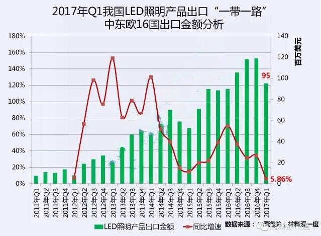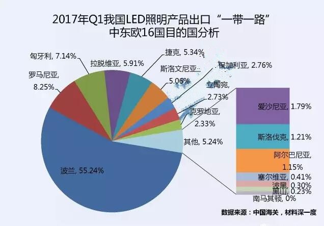 ? 據統計,2017年一季度我國LED照明產品出口中東歐16個國家的總金額達9508萬美元,同比增加5.86%