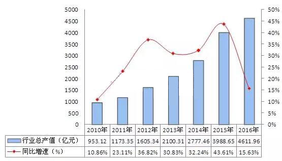 ? LED企業整體經營效益向好,源于LED產業產銷規模的穩定增長。數據顯示,2010-2016年,中國LED行業工業總產值呈逐年快速增長趨勢,2016年實現工業總產值4611.96億元,同比增長15.63%。