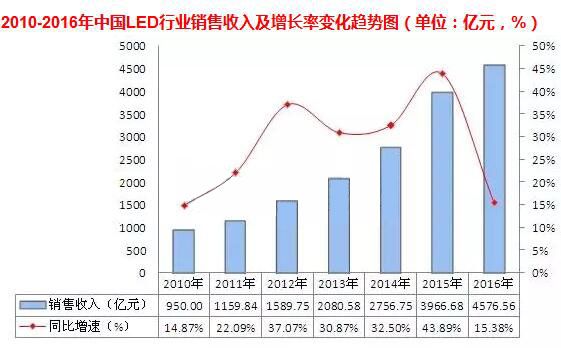 ? 需求方面,2010-2016年,中國LED行業銷售收入呈逐年增長趨勢,其中2016年實現銷售收入4576.56億元,同比增長15.38%。