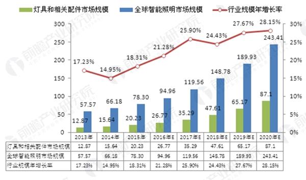 ? 數(shù)據(jù)顯示,2013年時(shí)全球智能照明市場(chǎng)行業(yè)規(guī)模約57.57億美元,其中燈具和相關(guān)配件市場(chǎng)規(guī)模約為12.87億美元;2015年全球智能照明市場(chǎng)規(guī)模達(dá)到78.3億美元,增長(zhǎng)十分迅猛。按照當(dāng)前發(fā)展勢(shì)頭,預(yù)計(jì)2020年可達(dá)243.41億美元,其中燈具和相關(guān)配件市場(chǎng)規(guī)模約為87.1億美元,占比超過5%,年復(fù)合增長(zhǎng)率超過20%。