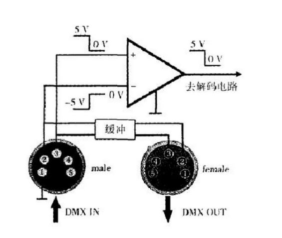 DMX512標準規(guī)定DMX接口用5芯卡依口,其中1芯接地,2,3和4,5芯傳輸控制信號(2,4為反相端,3,5為同相端),4,5芯原打算傳輸燈光設備的狀態(tài)及錯誤檢測等信息,后來閑置不用。之所以要求用5芯卡依口而不是更為常見的3芯卡依口,是為了防止不小心和專業(yè)音響上常用的3芯卡依口產(chǎn)生誤連接,因為音響設備上連接電容話筒的3芯卡依口可對外提供48 v的幻像電壓,這種錯誤連接,極易燒壞內(nèi)部電路。盡管如此,很多電腦燈還是采用了3芯卡依口,如出現(xiàn)兩種卡儂口并存的情況,要用轉(zhuǎn)接器予以正確轉(zhuǎn)接。