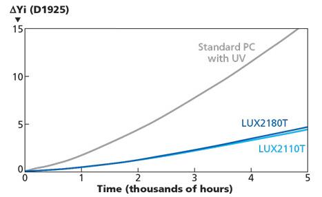 雖然PMMA對于天氣和紫外線(UV)輻射抗性方面表現優于PC,但PC仍然在這些領域取得了進展。例如,SABIC的LEXAN SLX樹脂專門設計用于縮小PC和PMMA之間在戶外應用中的差距。LEXAN SLX樹脂可以抵抗由于紫外線曝光而出現的變黃,并且保持其光澤度、顏色穩定性和機械性能的時間比標準PC長五倍以上。標準PC由于紫外線照射而降級,降低元件的延展性并使其變脆。圖3中的室外照明透鏡顯示了用LEXAN SLX樹脂和標準PC制成的組件在用紫外線(UV)曝光2900小時后的變黃比較。為了捕捉差異,將透鏡放置在裝有175W金屬鹵化(MH)燈的熱室中,在折射器上在120℃下放置2900小時。